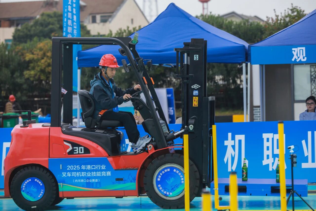 本次大赛由中国港口协会与中国海员建设工会全国委员会联合举办,内河港口企业赛道共吸引来自25家单位的49名选手参加。大赛采用“红外电子评分系统+人工辅助评分”的考评方式,设置“理论考试+技能操作”两个环节:理论考试涉及机械基础、叉车例检例保、叉车工作原理、发动机和液力传动、安全操作事项等相关内容;技能操作设置实干笃行、强基固本、专业精进、勇攀高峰四大关卡,考验选手在快速通过障碍、精准堆放货盘、灵巧拾币投壶、平稳搭建杯塔方面的综合能力。